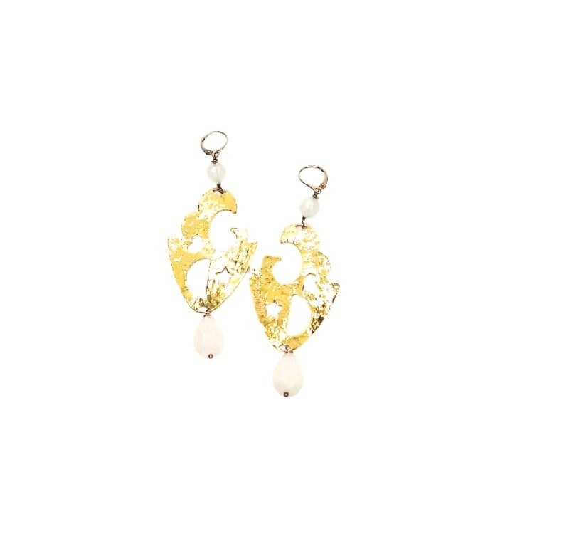 Brass with Pink Quartz Moon and Star Design Drop Earrings